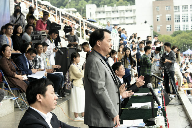 运动会组委会主任、副校长黄炎和在开幕式上致辞,他代表校党委、校行政向精心筹备本届运动会的全体工作人员表示衷心的感谢,向参加本届运动会的全体运动员、教练员、裁判员以及参加演出的师生们表示亲切的慰问和美好的祝愿!黄炎和指出,近年来,学校迎着“双一流”高水平大学建设的东风,高度重视体育工作,积极倡导全员健身,开展了丰富多彩的阳光体育运动,较好实现了群众体育与竞技体育的协调发展。一年来,学校在体育教学和竞技体育方面都取得了长足的进步,捷报频传,共获得国家级和省级奖项66项,在刚刚闭幕的福建省第十六届运动会上,我校代表团在男、女气排球等11个项目中分别夺得第一名,学校因此也获得体育道德风尚奖殊荣。他指出,以上这些成绩的取得,都是我校在繁荣竞技体育和倡导全员健身运动上的生动体现,有助于在我们凝心聚力,营造积极向上的体育文化氛围,进一步为学校事业高质量发展汇聚强大的动力,并希望通过运动会这一形式,全校上下进一步形成热爱体育运动、弘扬和传承体育精神的浓厚氛围,将体育运动中所蕴涵的奋斗精神和拼搏精神融入到学校新一轮的改革发展中,转化为广大师生奋发有为的前进动力,为学校全面推进“双一流”高水平大学建设做出新的、更大的贡献。
