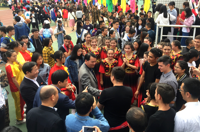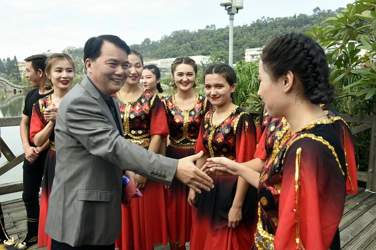 11月7日上午,我校第十九届校运动会在北区田径运动场拉开序幕,来自维吾尔族、哈萨克族、柯尔克孜族的24位同学表演了新疆少数民族舞蹈《丝路风情》。演出结束后,校党委书记严金静、副书记曾华平来到同学们当中,与他们亲切交谈,同学们热情的给校领导献上新疆花帽。严金静充分肯定了同学们的精彩表演,详细询问了他们在校期间的学习和生活情况,勉励同学们刻苦学习、发奋图强,立志成为担当民族复兴大任的时代新人。