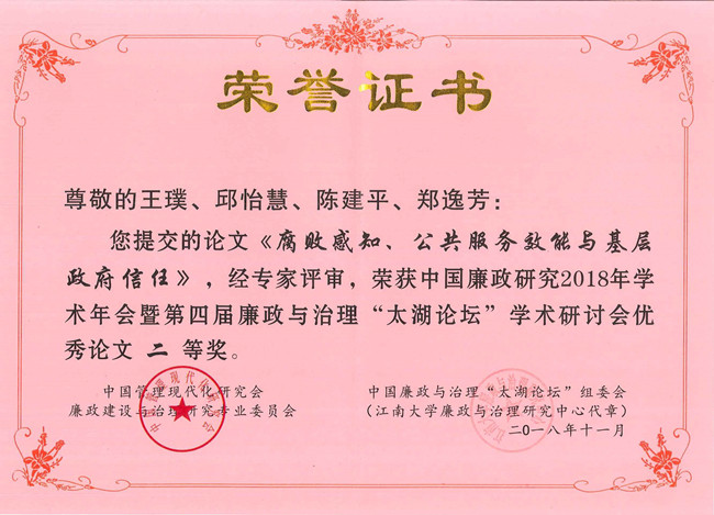 11月10日,中国廉政研究2018年学术年会暨第四届廉政与治理“太湖论坛”在江南大学召开。来自中国人民大学、复旦大学、南开大学、西安交通大学、湖南大学等高校和权威学术期刊的200多位代表参加了本次论坛。我校公共管理学院王璞、邱怡慧同学、陈建平、郑逸芳老师合著的《腐败感知、公共服务效能与基层政府信任》一文获得优秀论文二等奖。这是依托福建省高校人文社科基地——农村廉洁建设研究中心完成的一项成果,系我校连续第四次在中国管理现代化研究会廉政建设与治理研究专业委员会主办的征文活动中获奖。会上,2016级公共管理学术型硕士研究生王璞作为获奖论文作者代表在大会分论坛交流环节进行了发言。