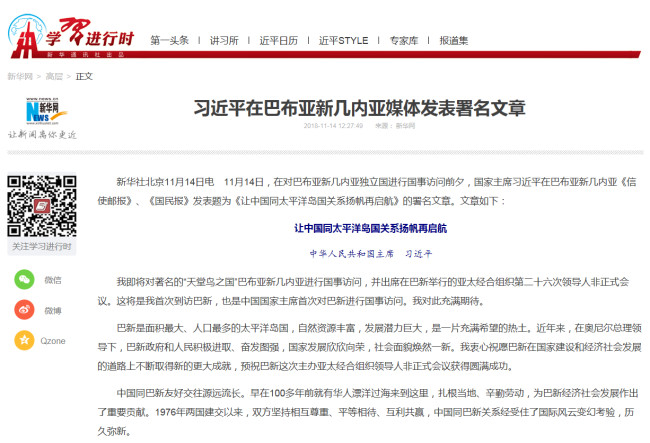 11月14日,在对巴布亚新几内亚独立国进行国事访问前夕,国家主席习近平在巴布亚新几内亚《信使邮报》、《国民报》发表题为《让中国同太平洋岛国关系扬帆再启航》的署名文章。文章如下: