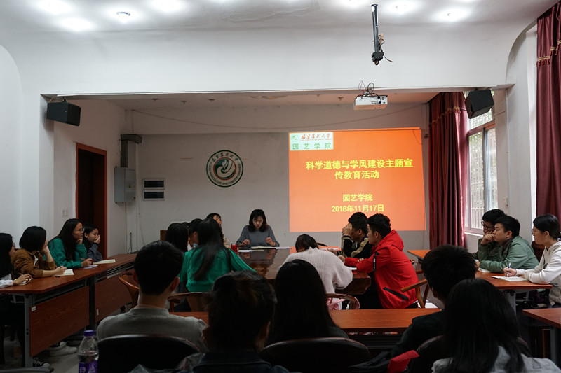 11月17日上午,园艺学院举办2018年研究生科学道德和学风建设宣讲教育活动,学院研究生辅导员叶一江、研究生会主席团成员和班级学生干部共45人参加会议。