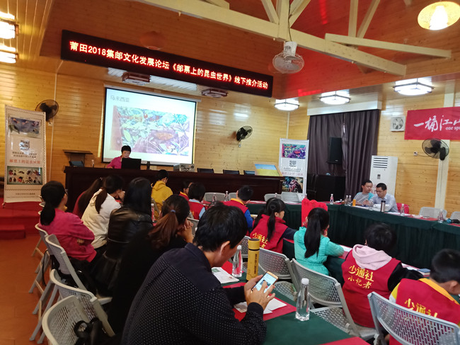 11月17日,在福建省莆田市荔城区西天尾镇后黄村南洋楼里,一场以“莆田2018集邮文化发展论坛暨《邮票上的昆虫世界》推介活动”吸引了上百位邮友的热情参与。参会嘉宾有莆田后黄旅游景区管理有限公司总经理、莆田市集邮文化产业创新基地负责人林金满,莆田市集邮协会副秘书长邱盛;莆田市老年集邮协会副秘书长方善光;福建省青少年集邮活动示范基地莆田五中集邮辅导老师吴帅;艾语佳青年志愿者服务站站长陈国粦以及莆田市一桶江山食品有限公司运营总监林永福。曾到访后黄的中华全国集邮联合会的会士宋晓文、赖景耀、马麟和台湾集邮家陈祥吉等发来热情洋溢的贺电。
