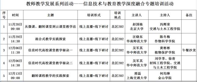 信息技术的进步带来了新技术、新设备、新模式的探索,推动了传统教育理念、模式与方法的变革,推动了学习方式和形态的转变,教育资源的开放共享是教育和信息技术融合发展的必然。本期信息技术融合课堂教学专题培训系列活动,围绕从微课、翻转课堂到云课堂教学法、混合式教学实践探索、信息时代高校课堂教学秘诀、翻转课程教学的实践探索等专题,通过观看北京大学赵国栋、华南师范大学汪晓东、华中师范大学吴军其、上海交通大学邢磊等专家的专题直播课堂,线下交通与土木工程学院冯辉荣、作物科学学院陈冬梅、植物保护学院黄彬彬、材料工程学院刘学莘、交通与土木工程学院徐青、金山学院何均琳等教师教学培训师分享经验和心得,共享名师智慧,用技术去创新教学,促进信息技术与教育教学融合发展。期待您的参与!