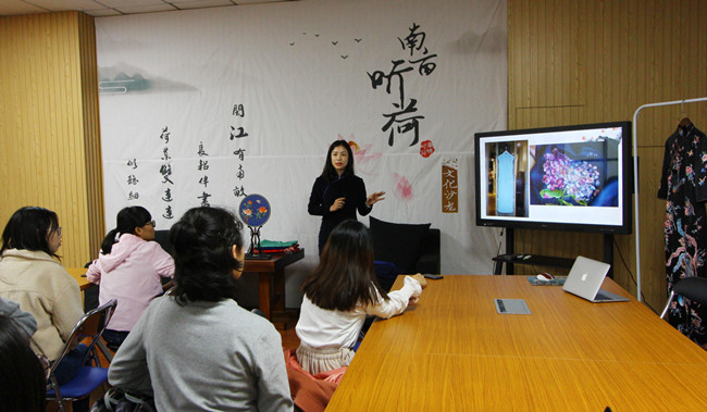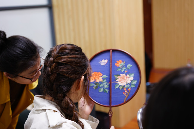 胡星月老师身着优雅的素色旗袍,讲述了这一满族传统服饰经过清代、民国一直发展到现代的整个演变过程;香云纱、缂丝、罗等珍贵面料的传统制作工艺;中国“四大名绣”各自的特点及用途;以及现代改良旗袍在设计中如何体现时尚感又不失中国古典韵律。胡星月老师还带来了珍贵的旗袍和缂丝工艺扇作品进行展示,并讲解如何正确得挑选适合自己的旗袍以及辨别真丝及手绣产品的真伪。互动环节中,师生们动手体验了“针间不容发,丝纤如毫毛”的“劈丝”工艺。