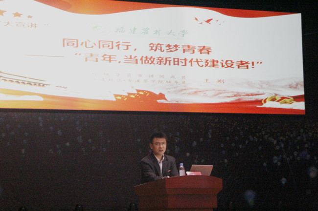11月22日晚,安溪校区·安溪茶学院于校区明德报告厅举办主题为“同心同行,筑梦青春——‘青年,当做新时代建设者!’”的辅导员宣讲团新思想“大宣讲”活动。本次宣讲活动由校辅导员理论宣讲团成员、安溪校区·安溪茶学院团委书记王刚老师主讲,分为2场进行,校区师生近2000人参加本次宣讲活动。