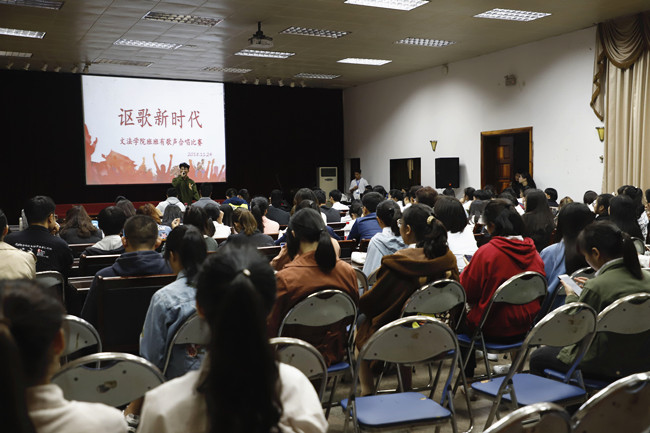 11月24日晚,文法学院于多功能厅成功举办“讴歌新时代”班班有歌声合唱比赛,共有2016级、2017级各专业11个班级参赛。