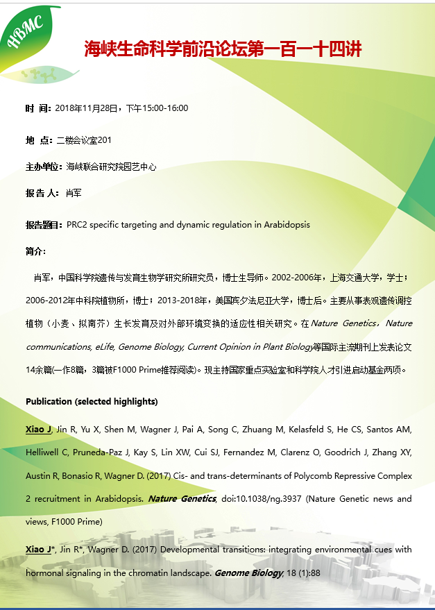 海峡生命科学前沿论坛第一百一十四讲(2018.11.28)——PRC2 specific targeting and dynamic regulation in Arabidopsis