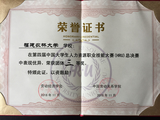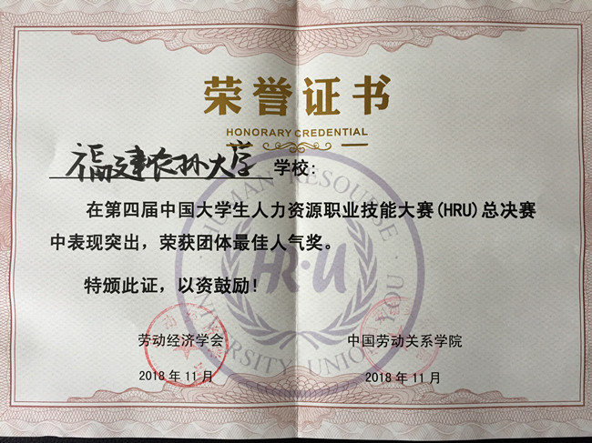 11月24-25日,第四届中国大学生人力资源职业技能大赛暨海峡两岸及港澳台地区人力资源职业技能大赛全国总决赛在中国劳动关系学院举办。我校公共管理学院学生参赛队(队员:梅开港、王以璇、邱叶曳、陈钰滢,指导及带队老师:周毕芬)代表我校参赛,获团体三等奖。此外,我校还获“团体最佳人气奖”(共5所学校获此殊荣),梅开港、陈钰滢同学分别获“最佳人气奖”(共10位选手获此殊荣)。