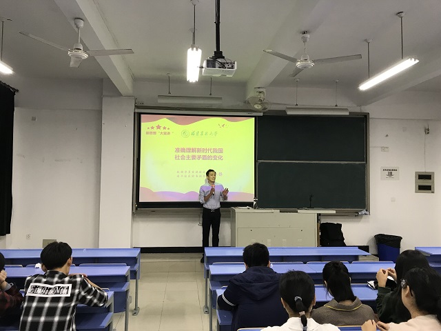 林锋老师阐述了我国社会主要矛盾在历史上的演变过程,对新时代社会主要矛盾的基本内涵进行解读,通过宣讲帮助同学们正确理解和把握了我国社会当前主要矛盾,找准自身定位,明确责任担当,争做有为青年。