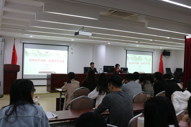 讲座上,郑逸芳主要从科学道德与学风、学术造假案例及科研不端的行为、危害与防范、预防和处理学术不端有关规定、希望与宣言等五个方面展开,她指出,人才培养不仅仅是在学术上,更是在思想道德上,学术是主干,道德是源头;并以多个反面典型案例,提醒大家要引以为戒;她要求同学们要讲诚信,重品行,以科学严谨的态度脚踏实地做学问,作一个有责任感、有理想、有能力、有担当的青年科研工作者。