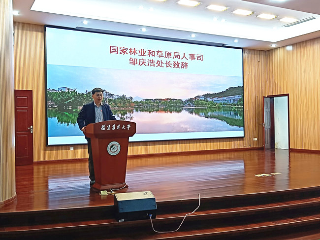 国家林业和草原局人事司教育培训处处长邹庆浩代表国家林业和草原局致辞,他就如何推动林学学科建设提出要加强顶层设计、服务行业发展、面向基层、加强国际交流等建议。