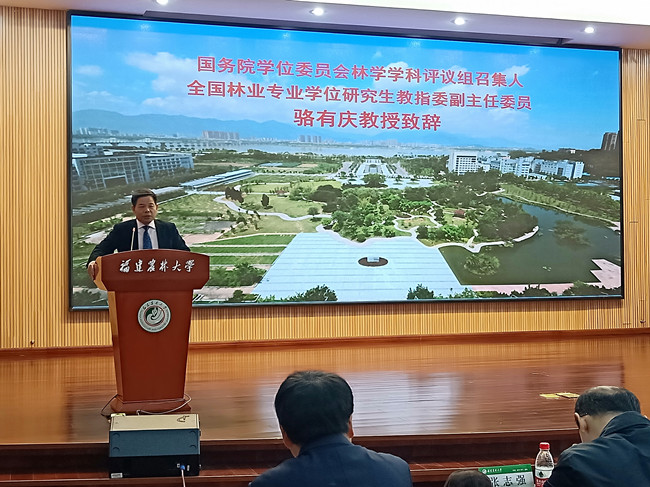 国务院学位委员会林学学科评议组召集人骆有庆代表国务院学位委员会致辞,他希望与会人员进一步深入交流,总结经验,共同促进全国林学学科的建设和发展。