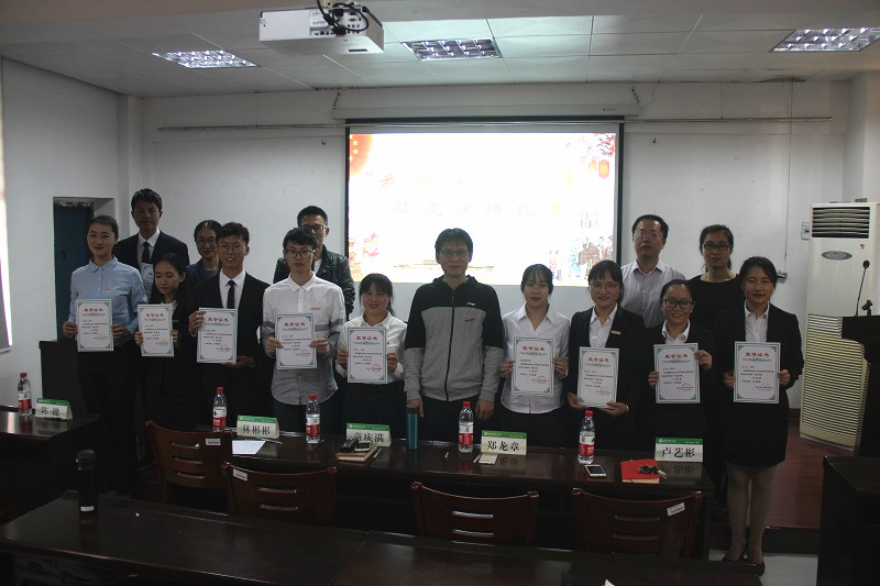 台上的选手激情澎湃地演讲,台下的观众也全神贯注地倾听。演讲结束,童庆满就10位选手的表现作精彩点评,最终叶建鑫同学以89.6分的好成绩获得本次演讲比赛的一等奖。