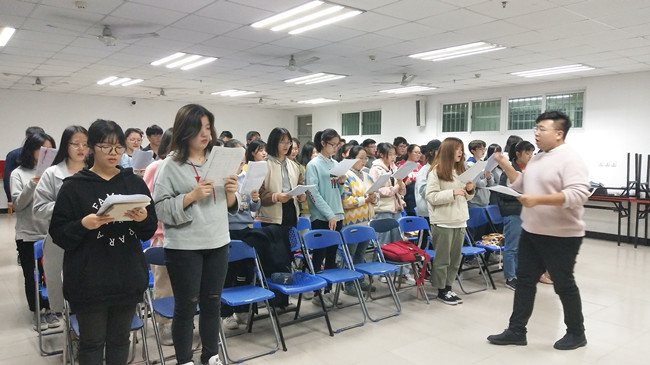 首先由院团委对各班级部分学生进行统一培训,随后让这部分学生回归班级进行教学传唱,以保证班级中每个同学都能学会校歌。最后由各班班委组织学生以学校建筑为背景拍摄校歌合唱视频。使得同学们进一步了解校园文化,同时弘扬校园精神。