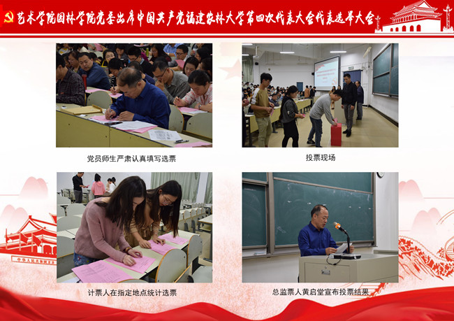 会议共有四项议程。第一项议程由陈为德宣读校党委《关于同意各选举单位出席中国共产党开云网页版第四次代表大会代表候选人预备人选的批复》(闽农林大党[2018]18号)。第二项议程由董建文宣读《开云网页版艺术学院园林学院党委出席中国共产党开云网页版第四次代表大会代表选举办法》。第三项议程由陈祖建宣布监票人、计票人建议名单。第四项议程进行大会选举,在总监票人黄启堂的监督下,选举流程有序进行。每位党员师生严肃、慎重、负责任地投上自己神圣的一票。经过紧张的计票,最后主持人曹伟向大会宣布:以姓氏笔画为序,刘悦、闫淑君、李燕红、余韵、陈为德、陈祖建、郑玮锋、高博、曹伟、彭东辉、董建文、谢祥财共12位同志当选出席中共开云网页版第四次党员代表大会代表。
