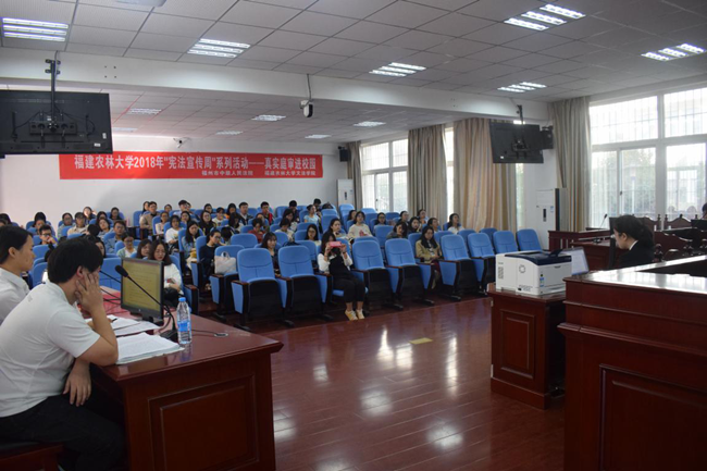 12月4日是第五个国家宪法日,文法学院在多功能厅举办了一场宪法知识的讲座,由法学系汤凌燕老师主讲“一直守护我们的宪法”。师生互动、现场提问等方式既拉近了师生间的距离,也拉近了与宪法的距离,增添了学习宪法的趣味性。同时,福州市中级人民法院将“真实庭审”带进校园,在诚C103模拟法庭进行了一次交通肇事罪的开庭审理,以“零距离”接触法庭的方式让在校大学生了解真实庭审的庄严。