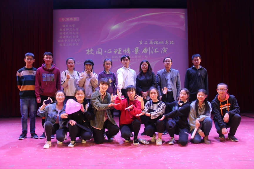 为深入贯彻落实党的十九大精神和全国教育工作会议精神,集中展示我省大学生精神风貌和校园文化生活,加强心理健康教育和宣传,进一步提升在校大学生心理健康意识,11月30日晚,福建省第二届榕城高校校园心理情景剧汇演在福州大学旗山校区图书馆博学厅举行,我校选送的心理情景剧《舍友》参加了汇演。