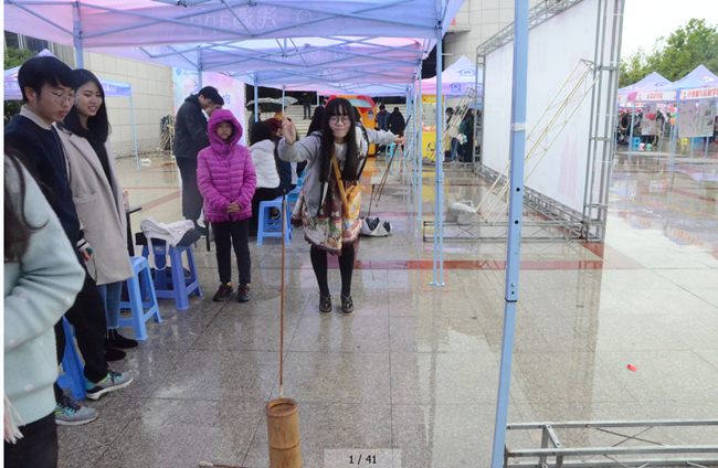 “活力呼啦圈”作为热门项目,现场十分火热。来自资环学院的钟林冰同学,以二十分二十秒的成绩打破了此次校园吉尼斯的第一个记录。她开心得表示说:“这个小游戏挺考验平衡力的,既要保证在呼啦圈不掉下来的前提下,绕着障碍走动,感觉全身都运动起来了。”