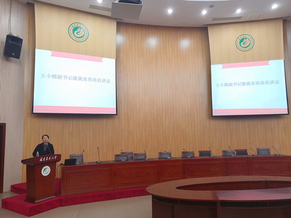 会上,王小榕做就业创业动员讲话。王小榕结合全国高校毕业生就业创业工作网络视频会议及校长兰思仁在文科类毕业生就业创业工作调研座谈会上的讲话精神,介绍当前的就业创业政策和就业形势,希望毕业生能认清形势,调整心态,树立先就业后择业的观念,利用好在校期间的求职黄金时间,顺利就业,同时也鼓励大家在当前乡村振兴战略的大背景下积极投身于基层的就业创业。随后,张阳阳老师做毕业生档案挂靠和就业协议书填写的指导,辅导员对就业过程中的安全问题做了补充和强调。
