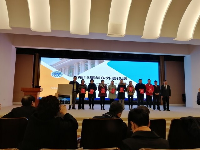 在12月8日上午的颁奖仪式上,周旭老师作为福建省获奖教师代表上台领奖。周旭老师连续多年积极参与论坛论文的投稿,并三次入选与获奖,此次是周旭老师继2016年荣获第13届华东外语论坛论文评选一等奖后再次夺得一等奖殊荣,展现了学院教师的学术水平和专业情怀。