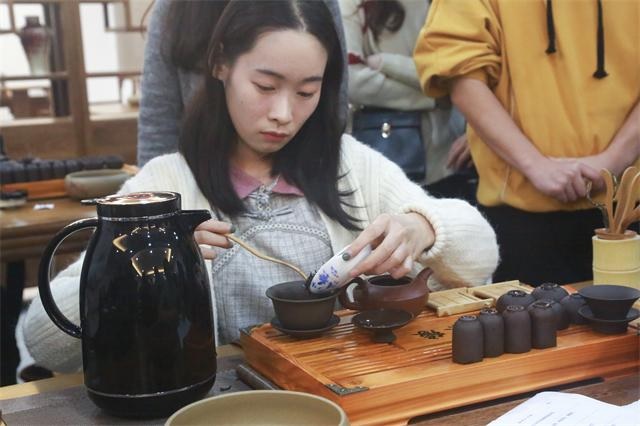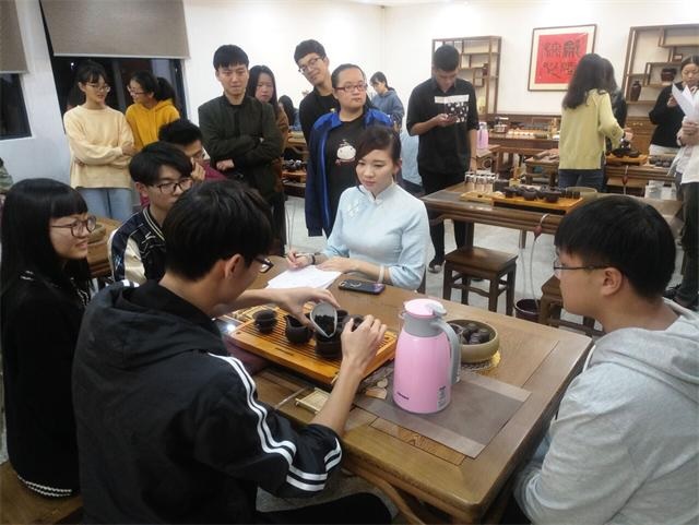 同学们围坐在茶桌旁,边学习边饮茶。同学们在两位老师的教导下学会如何为泡好一杯好茶的工序。