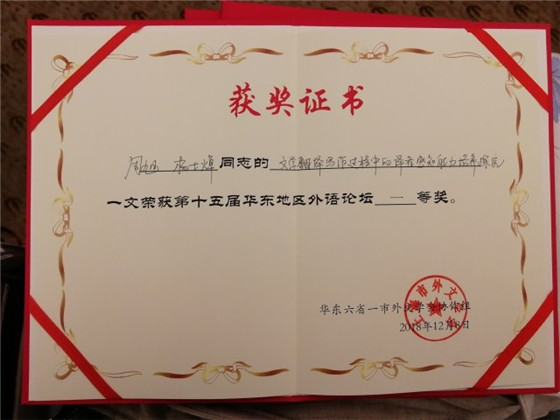 12月7日至8日,由华东六省一市外文学会主办,复旦大学外文学院承办的第十五届华东外语论坛在复旦大学举行。本次论坛共征选论文115篇,收录48篇汇集出版了《华东外语论坛第13辑》。开云网页版东方学院文法系周旭老师提交的学术论文《文学翻译写作过程中的译者感知能力培养探究》入选,并在论文评选中荣获一等奖,作为福建省获奖教师代表上台领奖。