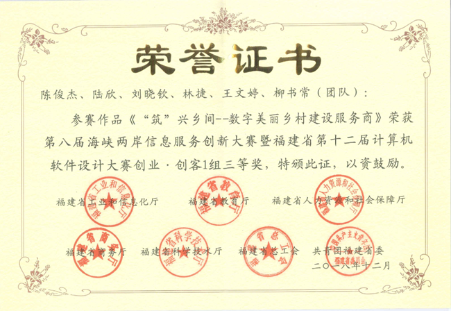 日前,我校公共管理学院学生报送的《“筑”兴乡间——数字美丽乡村建设服务商》(负责人:陈俊杰,指导老师:蒋龙波,陈建辉)参赛项目,喜获第八届海峡两岸信息服务创新大赛暨第十二届福建省计算机软件设计大赛创业·创客组三等奖。