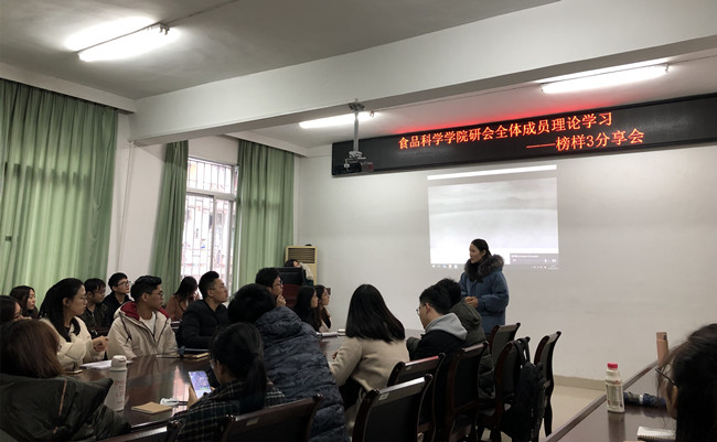 深入学习领会习近平新时代中国特色社会主义思想和党的十九大精神,12月14日,食品科学学院研会全体成员观看《榜样》系列第三期专题节目,一同学习榜样精神,凝聚复兴力量,辅导员王欢老师主持分享会。