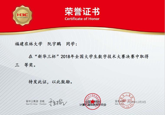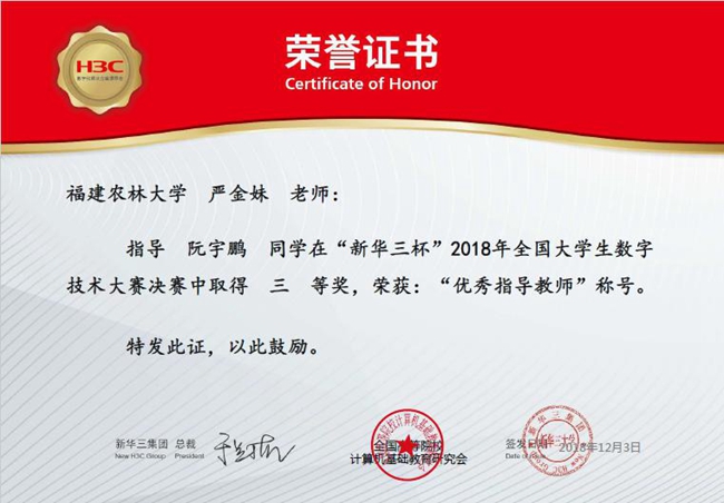 11月30日至12月3日,2018年“新华三杯”全国大学生数字技术大赛决赛在杭州举行,进入决赛的全国100名本科院校和100名职业院校的选手在这两天里进行激烈追逐,我校计算机与信息学院2016级网络工程专业学生阮宇鹏获得本科组三等奖,学院教师严金妹荣获“优秀指导教师”称号。