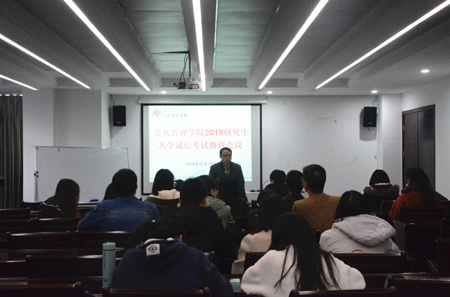 12月19日下午,公共管理学院于公管楼305举办2019研究生入学诚信考试教育会议。会议由学院党委副书记陈建辉主持,2019届全体考研学生参加。