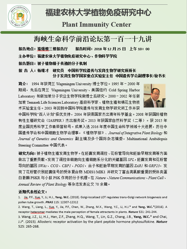 海峡生命科学前沿论坛第一百一十九讲(2018.12.25)——被子植物精子传递的分子机制