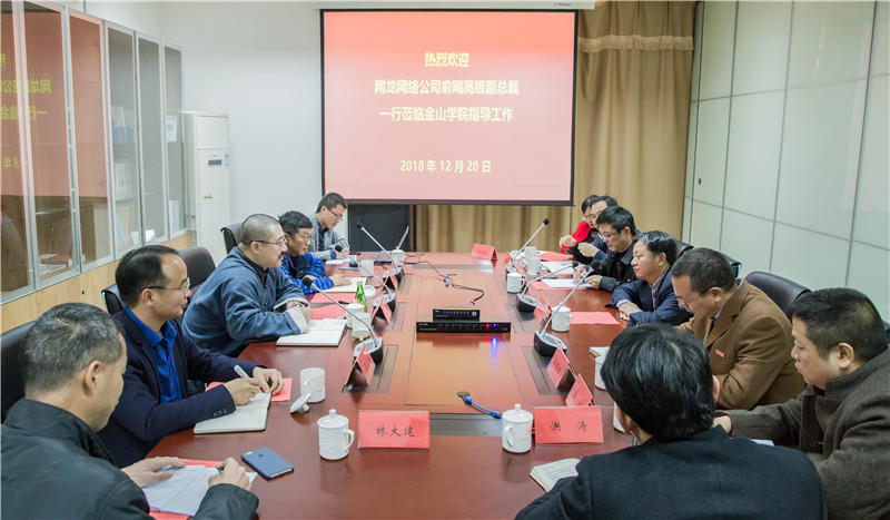 12月20日上午,网龙网络公司高级副总裁、网龙华渔教育科技有限公司董事长俞飚一行3人来金山学院调研考察,并就推进双方合作相关事宜进行洽谈。校长、金山学院董事长兰思仁在学院经济管理省级实验教学示范中心会议室会见了客人。学院领导班子及院办公室、研究发展处负责人参加会见并与客人座谈交流。