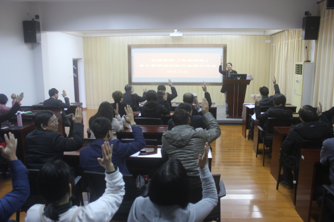 最后,在全体代表会议上,全体参会代表一致通过了院长工作报告、工会工作报告和财务报告,审议通过了大会决议。