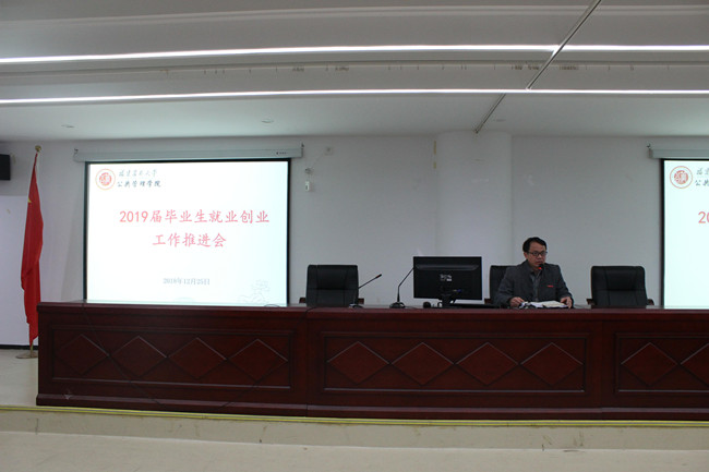 12月25日下午,公共管理学院于公管楼201召开毕业生就业创业工作推进会,会议由学院党委副书记陈建辉主讲,毕业班辅导员和全体2019届毕业生参加了会议。