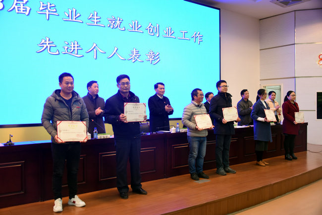 会议还对2018届毕业生就业创业工作先进集体和先进个人以及2018年第四届中国“互联网+”大学生创新创业大赛、2018年“创青春”全国大学生创业大赛获金银铜奖项目的学生和指导老师进行了表彰和颁奖。