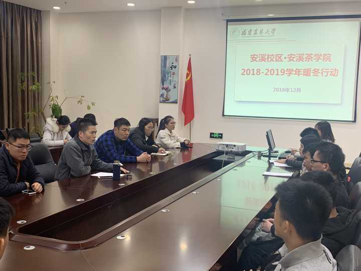 为进一步关爱校区家庭经济困难学生,在寒冬中把学校的爱与温暖送给学生。12月29日,安溪校区·安溪茶学院于行政楼二楼会议室开展2018—2019学年“暖冬行动”。校区党委副书记黄成茂、校区全体辅导员及受助家庭经济困难学生参加会议。