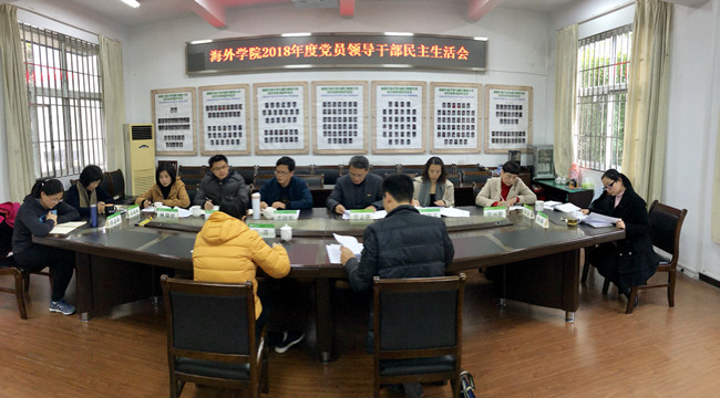 1月16日下午,海外学院党委在305会议室召开2018年度党员领导干部民主生活会。学院党员领导干部参加会议,党外中层以上领导干部、院党委委员、工会主席及科级干部列席会议。校第二督导组组长、校党委组织部部长戴祐坤,督导组成员、学工部正科级辅导员陈菁到会督导。院党委书记罗志雄主持会议。