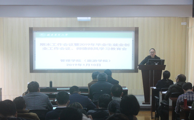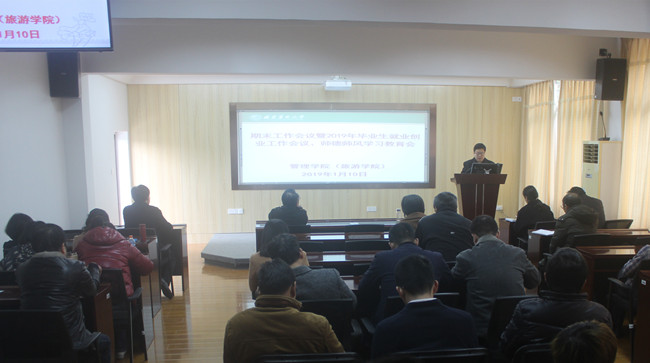 1月10日下午,管理学院召开全体教职工大会传达学校2019年毕业生就业创业工作会议暨期末工作会议精神,结合学院实际,就进一步做好2019年毕业生就业创业工作提出要求,并部署期末各项工作,会议由院党委副书记王小榕主持。
