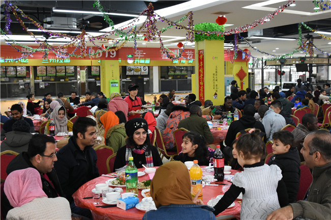 据悉,今年全校共有两百多名学生和部分教师、后勤保卫等职工留校过年,其中留学生有133人。为了让留校师生感受喜庆年味、冲淡思念乡愁,多年来校领导与留校师生共度除夕已成为学校的传统。学校相关部门也提前策划、精心准备了丰富多彩的节日活动,让身在异国他乡的留校师生每年都能从这别样的团圆中感受到一样的暖意,并成为许多师生难忘的珍贵回忆。年夜饭后,学校还在多功能厅组织大家一同收看春节联欢晚会直播,让师生们在热闹欢乐的氛围中共同迎接新年的到来。