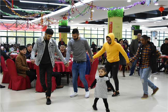 喜庆的大红灯笼、溢满笑容的张张脸庞、庆祝新年的悦耳歌声,勾勒出一幅和谐欢乐、春意盎然、共迎己亥的新春画卷。大家一同品尝丰盛美味的年夜饭,畅谈家乡的过年习俗,分享工作学习生活的点点滴滴,举杯互致新年的问候和祝福,共同合影留念。师生们还精心准备了庆祝节目,轮番上演,精彩纷呈。留学生演唱的中文歌曲《月亮代表我的心》、表演的舞蹈、空手道等节目将现场的氛围点燃,引来阵阵掌声。一个多小时的表演,欢声笑语不绝于耳。
