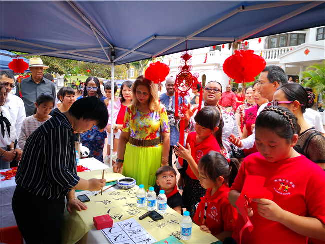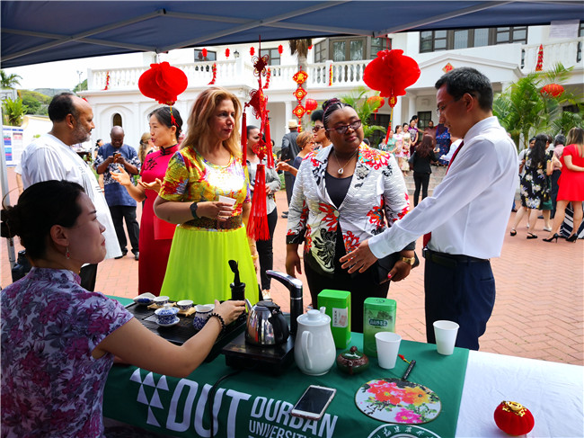 当地时间2月9日,中国驻德班总领馆在馆内举办“中国改革开放40周年图片展暨庆祝建馆20周年开放日”活动。德班市副市长皮尔、祖鲁王后普米、部分华人华侨和中资机构代表等200余人参加。德班理工大学孔子学院作为协办方,为本次开放日活动增添了一抹浓郁亮眼的中国色彩。