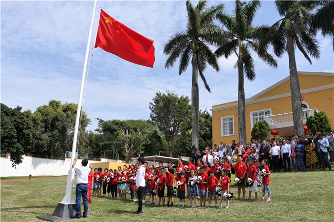 随后,来宾们一起参加了庆祝德班总领馆建馆20周年升国旗仪式。中外方来宾、侨胞与德班孔院下设教学点树德书院学生们在国旗下整齐排列,鲜艳的五星红旗冉冉升起,雄壮的中华人民共和国国歌响彻天空。礼毕,费明星总领事向中外方来宾致以诚挚的问候与感谢,并送上新春祝福。