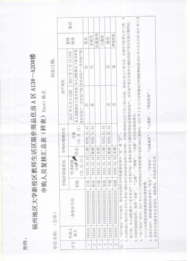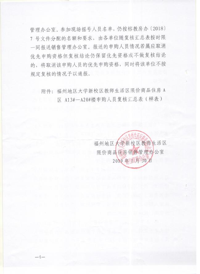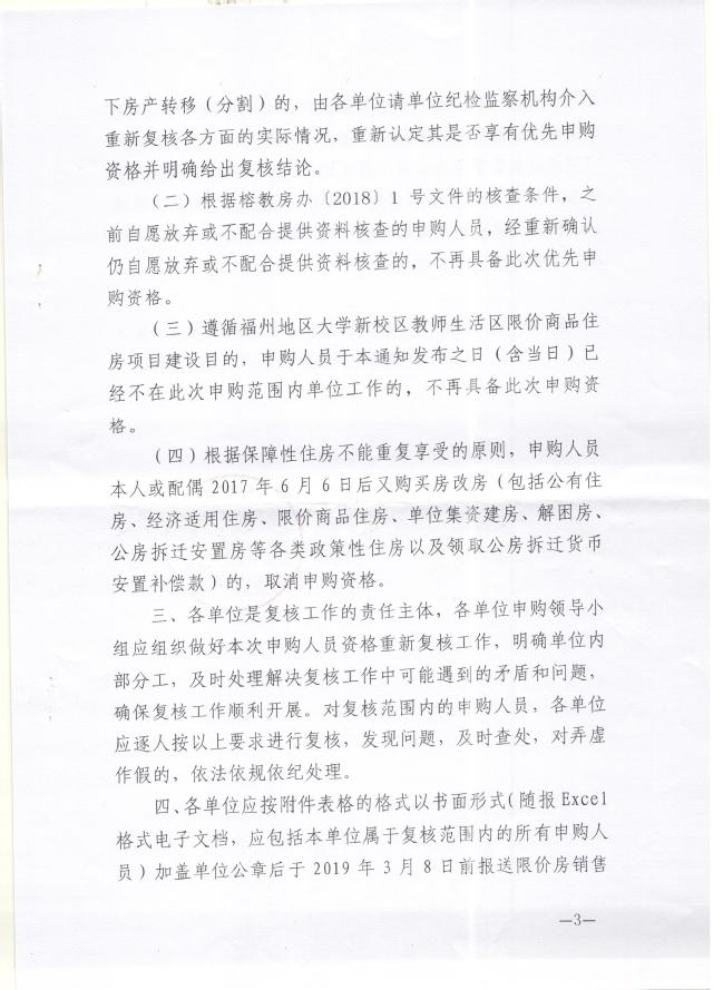 根据2019年1月30日福州地区大学新校区教师生活区限价商品住房销售管理办公室印发的《关于做好福州地区大学新校区教师生活区限价商品住房A区A13-A20号楼申购人员资格重新复核工作的通知》(榕教房办〔2019〕1号)要求,现就做好我校申购人员资格重新复核工作有关事项通知如下: