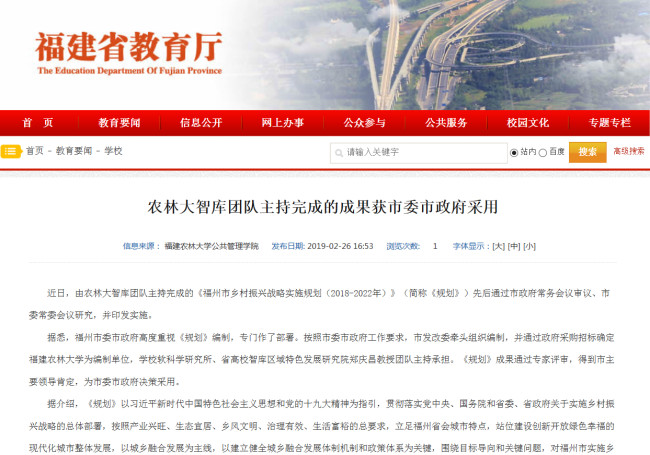 近日,由农林大智库团队主持完成的《福州市乡村振兴战略实施规划(2018-2022年)》(简称《规划》)先后通过市政府常务会议审议、市委常委会议研究,并印发实施。
