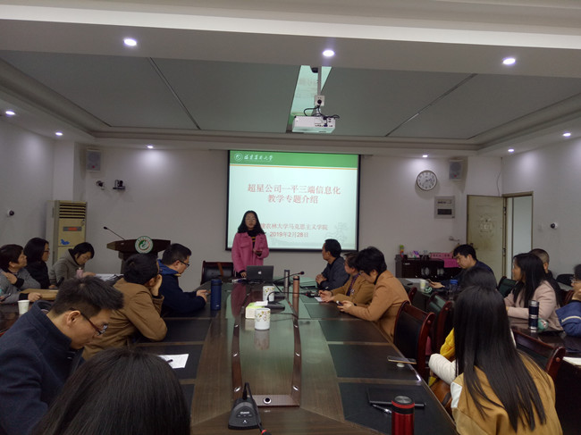 2月28日下午,马克思主义学院邀请超星公司于明德楼613开展了“一平三端”信息化教学专题讲座,来自马克思主义学院的30余名教师参与了此次交流讲座,讲座由刘淑兰教授主持,超星公司姜颖老师主讲。