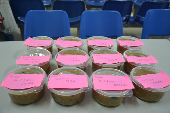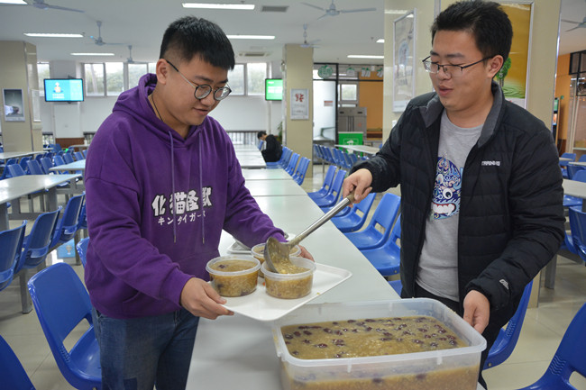 下午两点,志愿者们齐聚食堂,在食堂阿姨的帮助下用事先准备好的身材烹煮拗九粥。“拗九粥又被称为孝九粥,其食材是很讲究的,不仅有糯米、红糖,还要加入红枣、芝麻、桂圆等食材。在拗九节这天,家家户户都要熬制拗九粥送给亲友,以求平安、健康。”出生于福州的青年志愿者工作部部长李晨旭同学向大家讲解到。