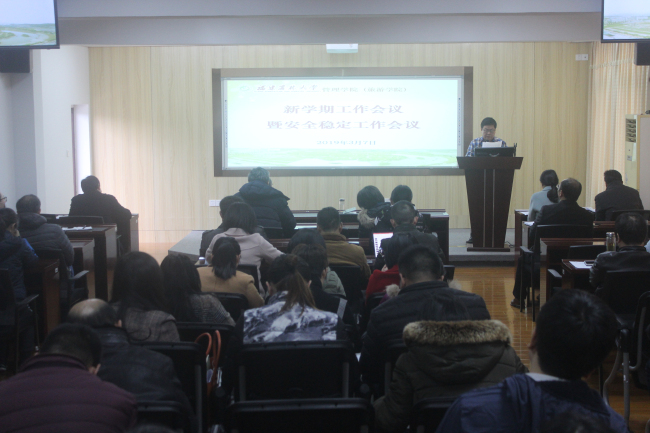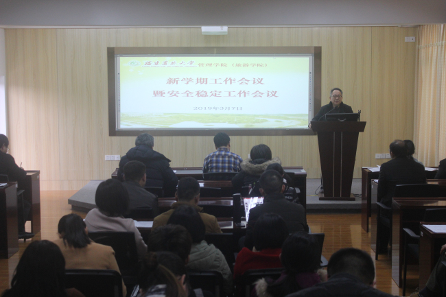 3月7日下午,管理学院召开全体教职工大会传达学习贯彻新学期工作会议暨安全稳定工作会议精神,院党委书记谢志鸣主持会议。