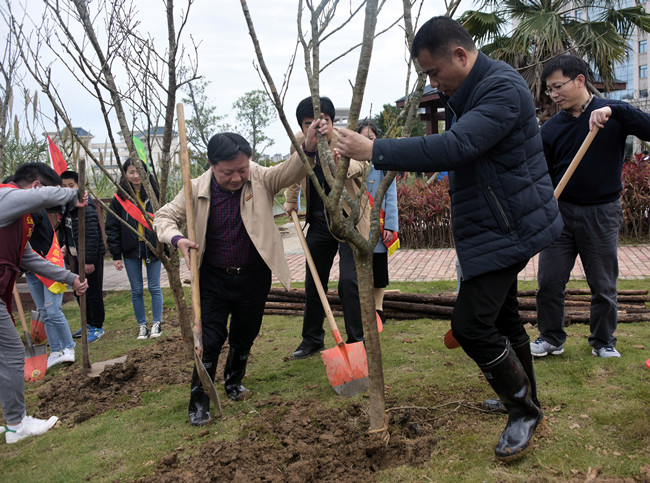 当天下午,春风和煦,老师和同学们分工协作,挥锹铲土、扶苗填坑、平土浇水,植树现场有条不紊,如火如荼。