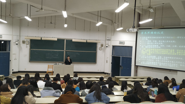“研究生科学道德和学术规范”主题讲座由副院长黄启堂主讲,再次解读了《关于加强学术道德建设的若干意见》,讲述了几种研究生常见的学术不端现象以及学术不端的严重后果,强调了学术规范的重要性。要求同学们在今后的学习生活中抵制和预防学术不端行为。并剖析了近期在社会引起热议的“翟天临学术风波”、“叶肖鑫学术不端”等事件,强调了学术道德、学术规范于个人学术生涯及集体学术信誉的重要性,告诫同学们不要心存侥幸,否则会悔恨终生。新学期的安全教育由学院研究生辅导员余韵主讲,主要结合校园典型的安全事例,重点围绕宿舍安全用电、防火、防盗、防诈骗,防“校园贷”,以及交通安全、饮食安全、校外兼职“陷阱”、心理健康,要求全体同学遵纪守法,遵守学校学院安全相关制度,加强日常安全自查自纠,提高安全防范意识,防微杜渐。
