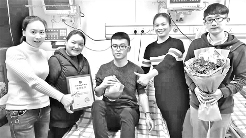 陈夏雨(中)完成造血干细胞采集后,同学们为他送上祝福